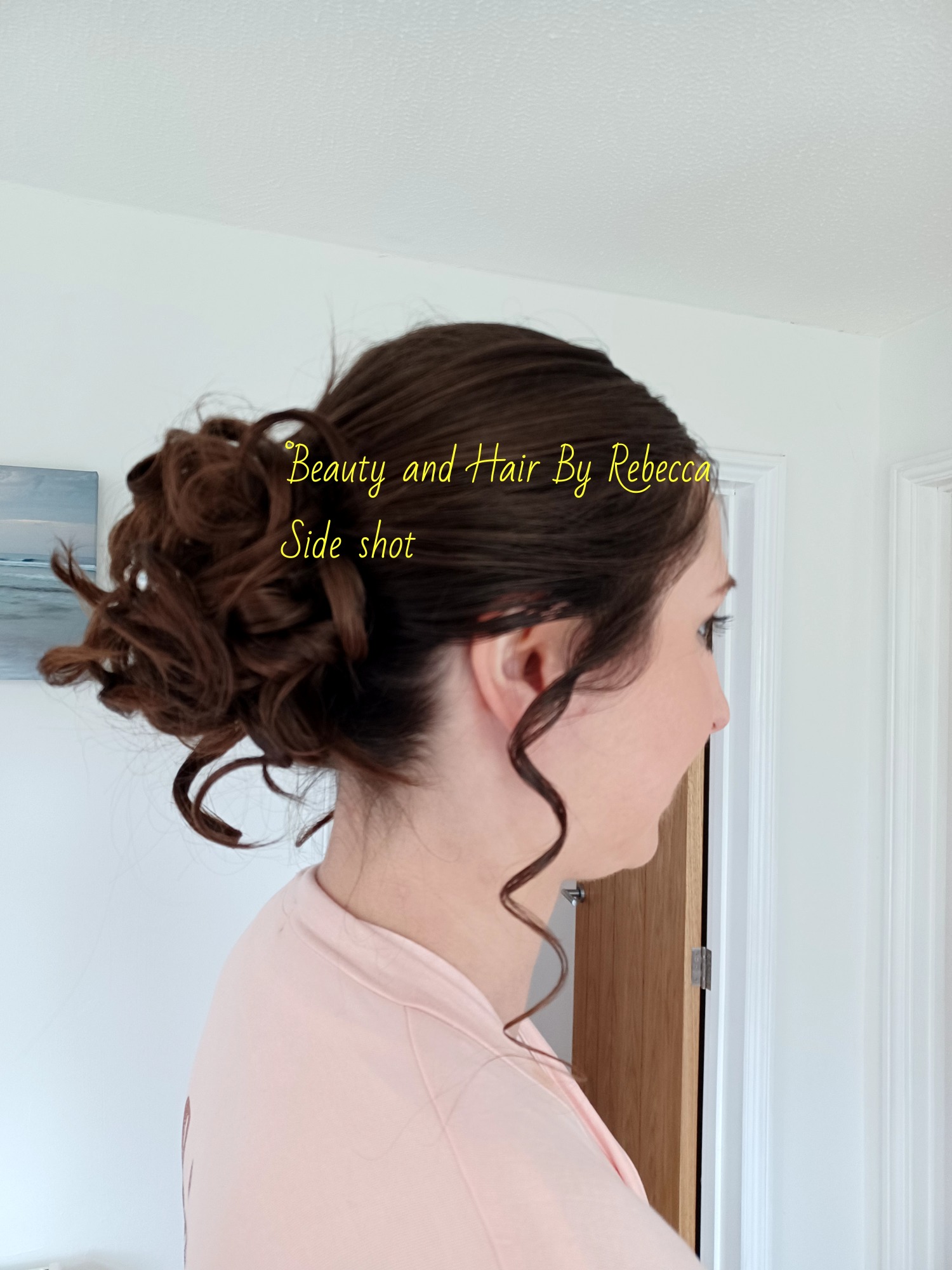 Side and part of back of curly bun with french plait, hair only.
